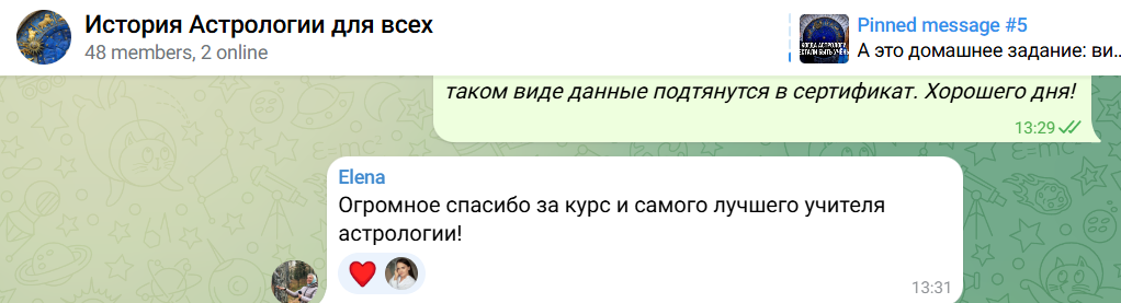 Что мне дало изучение Астрологии у Евгения Валентиновича: я нашла единомышленников, с которыми мне интересно общаться; конечно же понимание своих собственных жизненных циклов ( было также интересно просмотреть ретроспективно свою жизнь и сделать определенные выводы); понимание своих сильных и слабых сторон (возможность себя оценивать объективно); понимание в какие периоды работать над определенными сферами жизни, ну и разумеется консультирование членов своей семьи, что они очень ценят))